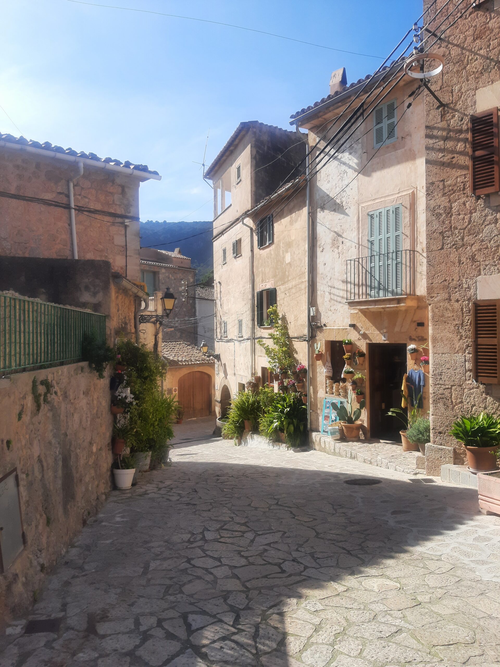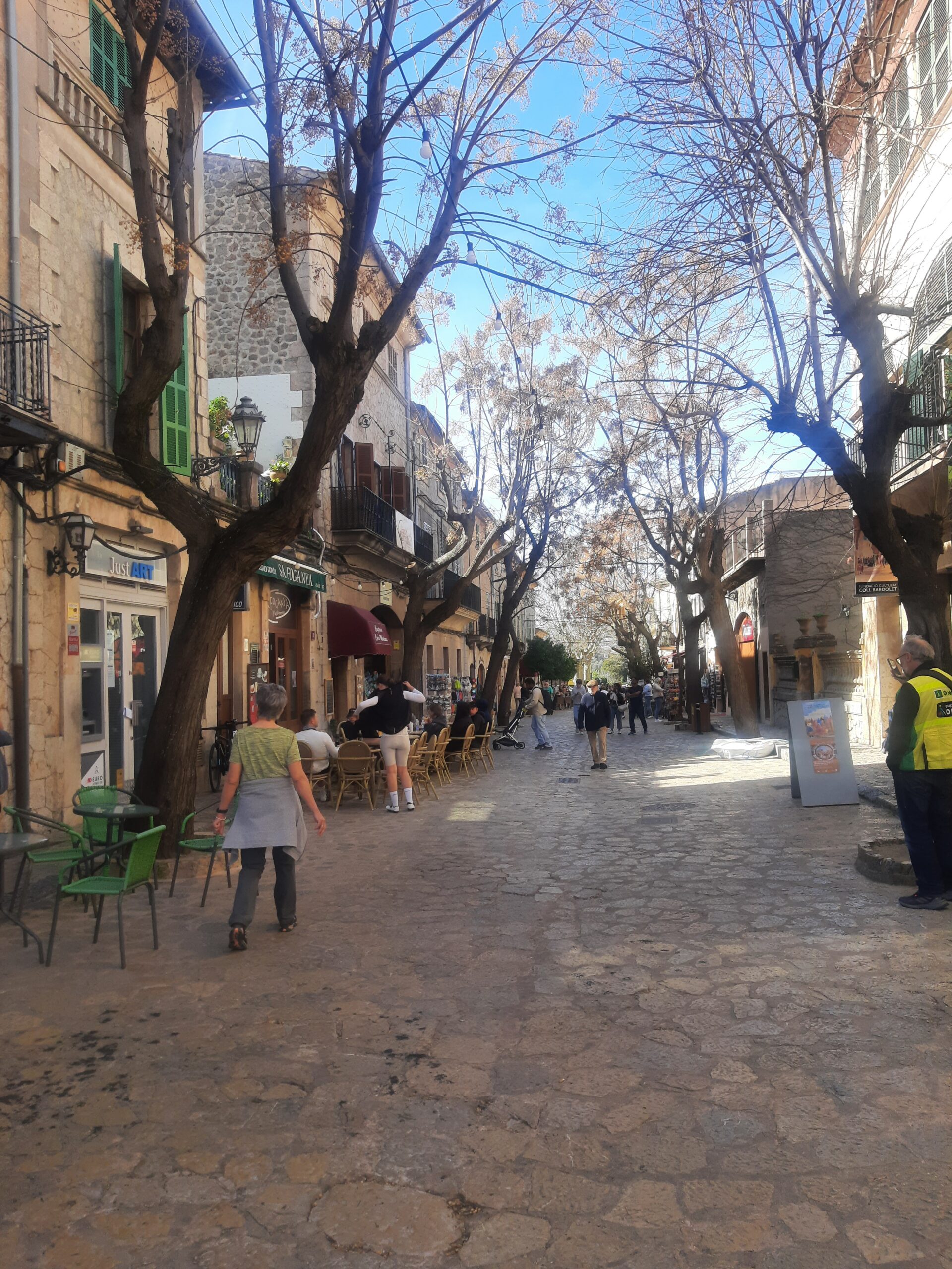 Banyalbufar an, ein Dorf mit bekannten Weinterrassen. In dem kleinen Parkhaus stellen wir unser Auto ab aber der Parkscheinautomat ist nicht funktionsfähig- oder wir zu ungeschickt. Wir fahren also wieder ab und es geht in Richtung Valldemossa. Nach längerer aber dann doch erfolgreicher Parkplatzsuche gehen wir in den Ort, der als einen der schönsten Bergdörfer beschrieben wurde. An der Hauptstraße machen wir in einem Cafe eine Pause und sehen uns das rege treiben der vielen Touristen an.
